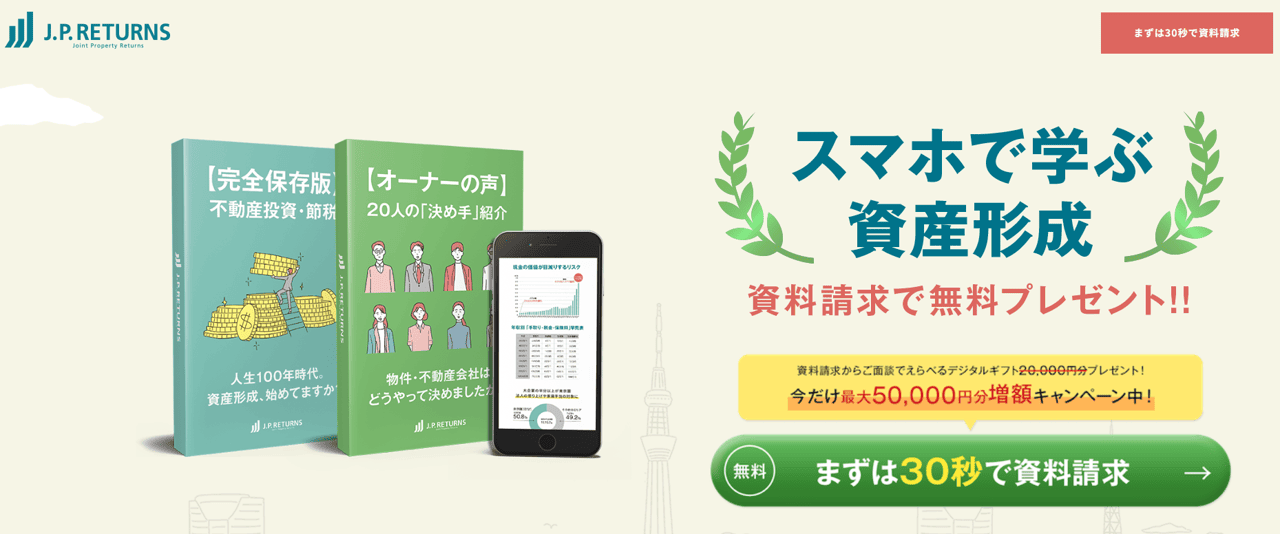 J.P.RETURNSは、高稼働/好立地エリアである「山手線内側」をメインの物件を取り扱っています。プロが厳選した物件をJ.P.RETURNSが借り上げをしているため空室リスクなしで不動産投資を実施できます。