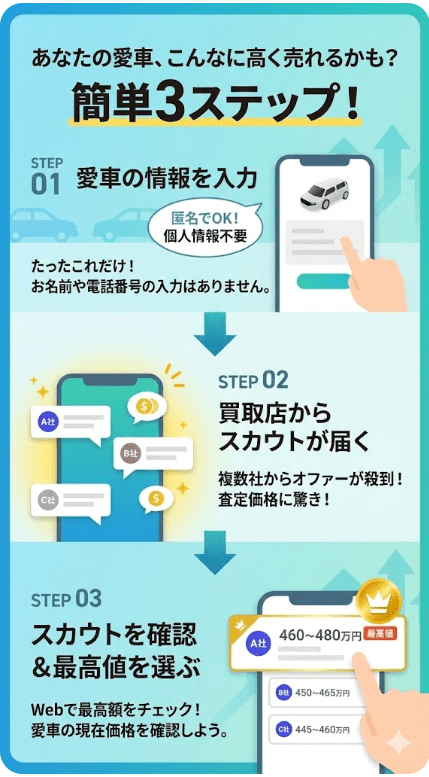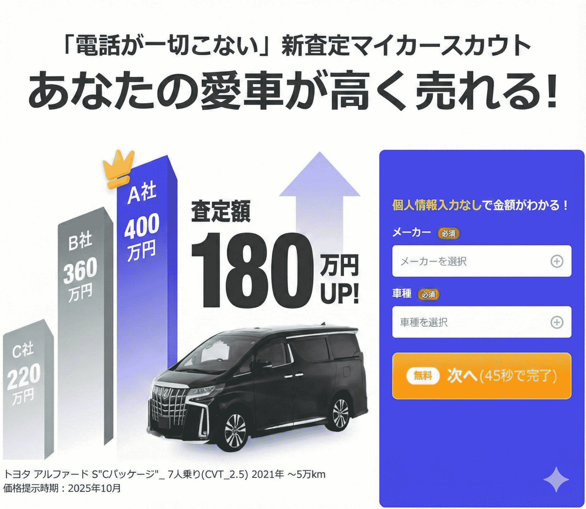 手間をかけずに最高額を狙うなら、マイカースカウト(LINEヤフー運営)でまずは愛車の価値を把握し、競争の火蓋を切ることが最短ルートです。