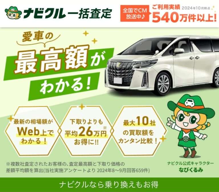 相場を知らずに査定に臨むと、業者の言い値で売却するリスクがあります。ナビクルなど信頼できるサービスで無料の概算額を知っておくだけで、「この価格以下では売らない」という交渉の基準が作れます。