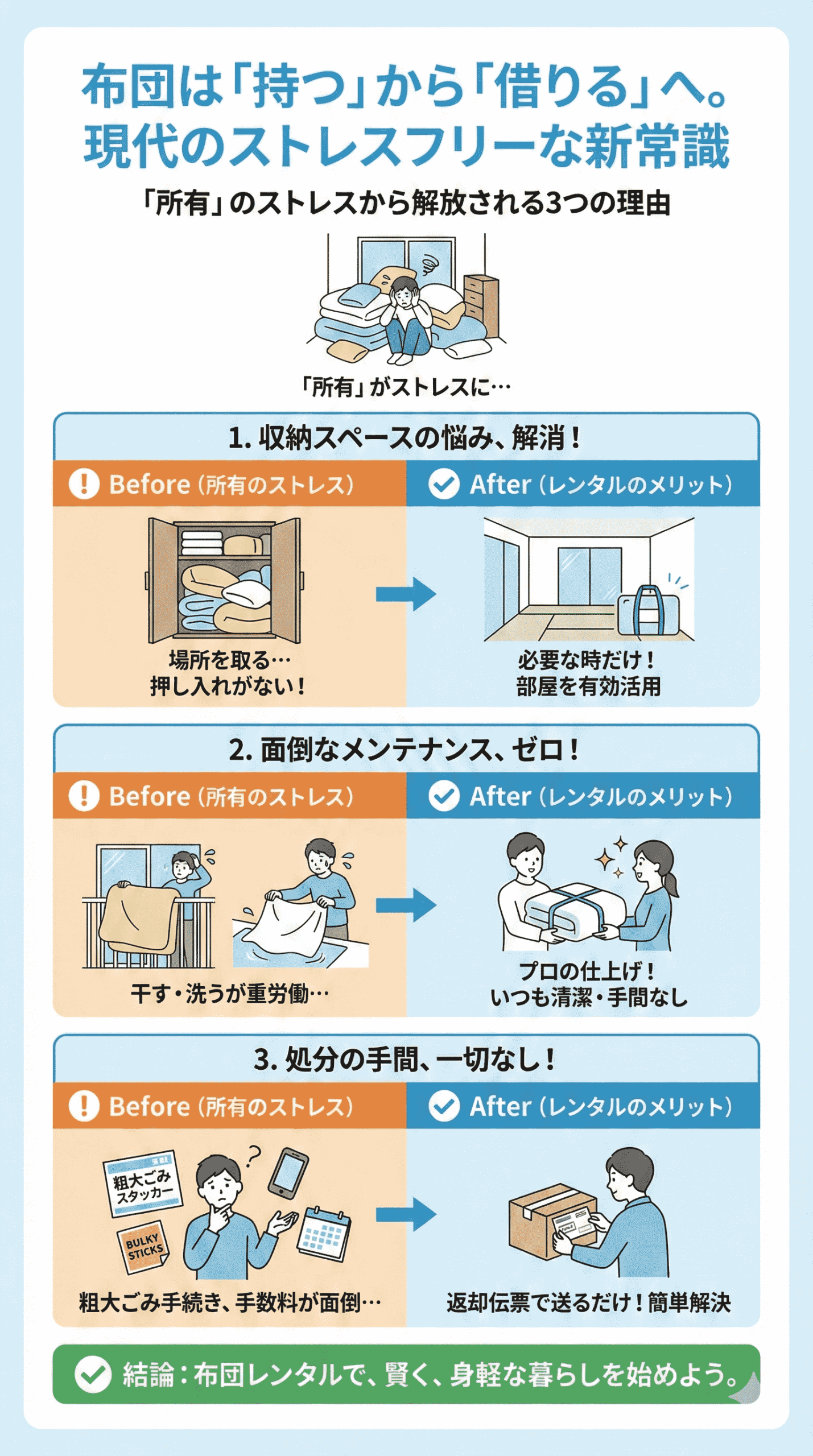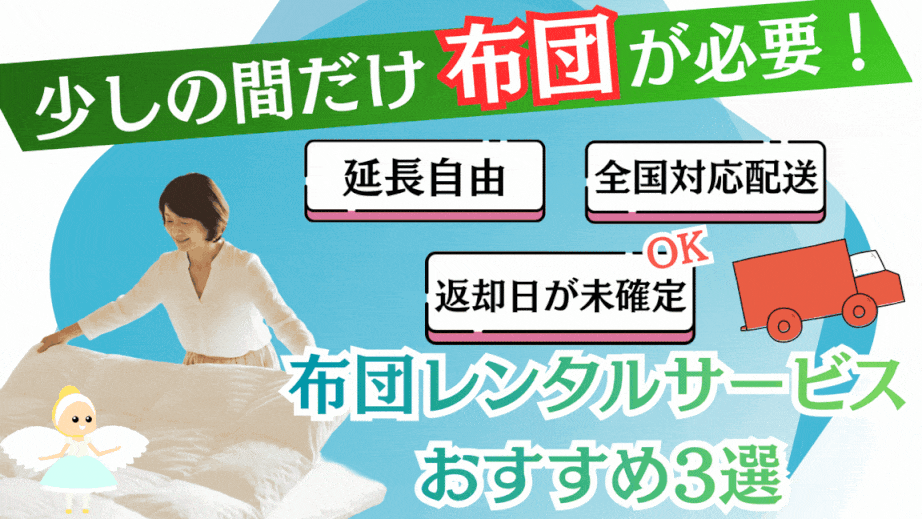 2ヶ月間2組借りさせて頂きました!両親を泊めれたのでほんとに助かりました。何より返品が楽!宅配の方がピックアップしてくれるのでこのシステムは良いですね。